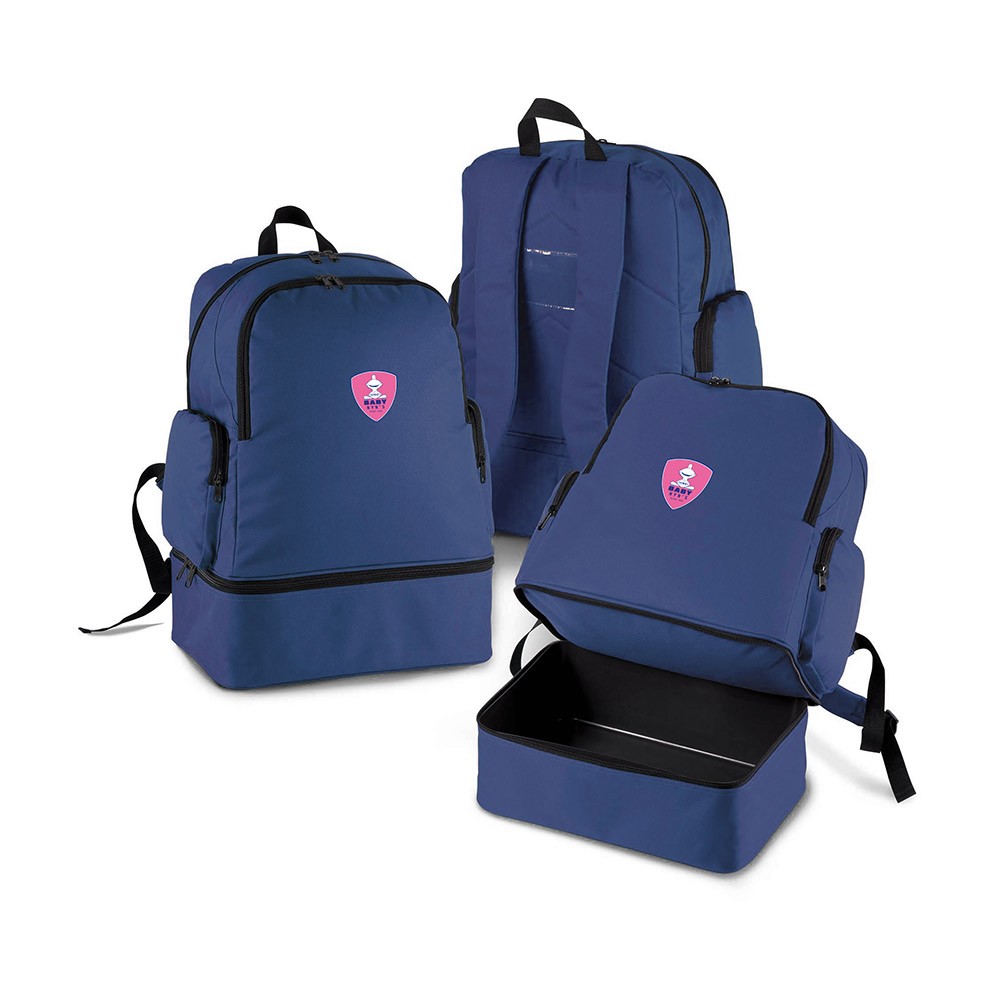 Sac à dos de sport en polyester Baby Nyn's. Base rigide détachable avec pieds en plastique. Une poche devant et deux poches côté zippées, porte carte.