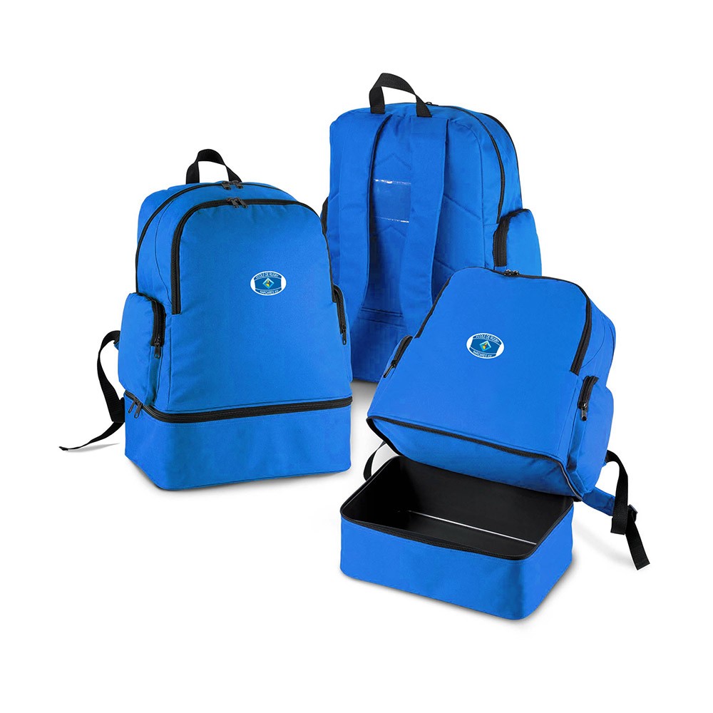 Sac à dos de sport en polyester. Base rigide détachable avec pieds en plastique. Une poche devant et deux poches côté zippées, porte carte.