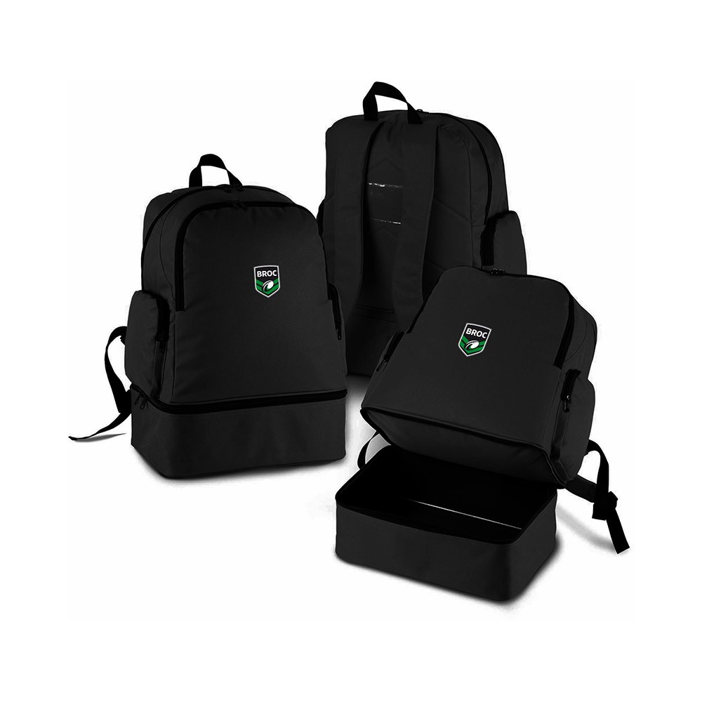 Sac à dos de sport en polyester BROC Boutenac. Base rigide détachable avec pieds en plastique. Une poche devant et deux poches côté zippées, porte carte.