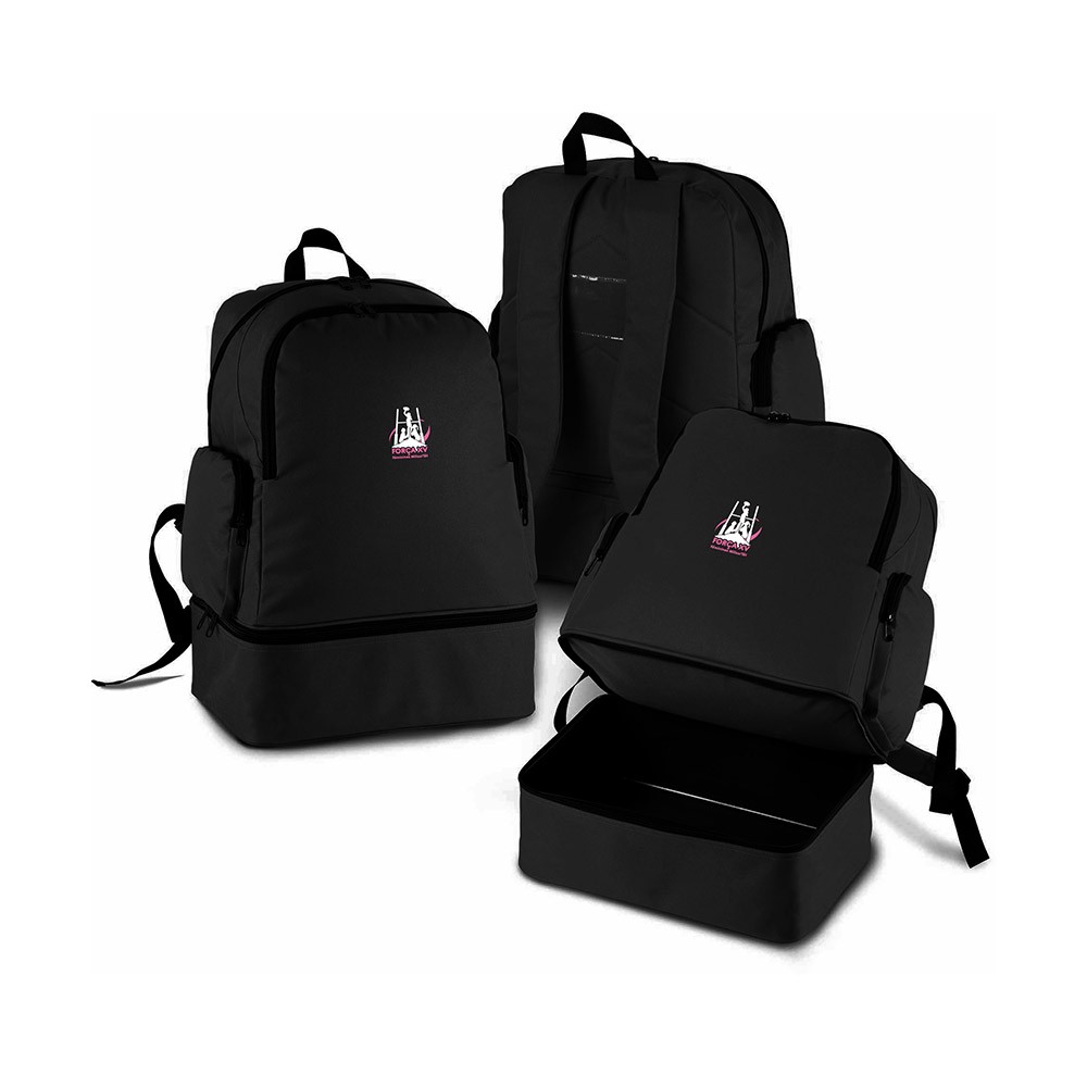 Sac à dos de sport en polyester Força XV. Base rigide détachable avec pieds en plastique. Une poche devant et deux poches côté zippées, porte carte.
