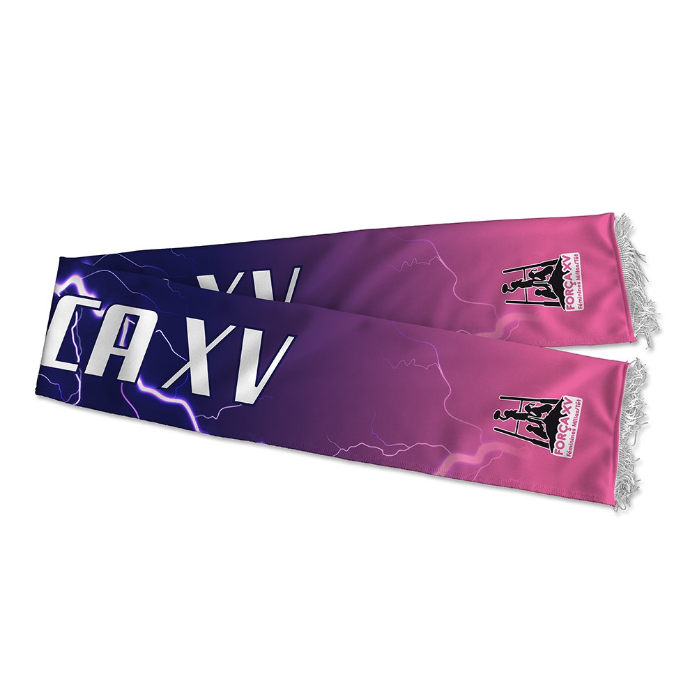 Écharpe supporter Força XV entièrement sublimée recto verso. 100% polyester. Nos produits 100% sublimés offrent une durée de vie incomparable, tant au niveau du tissu qu’au niveau de la tenue des couleurs.